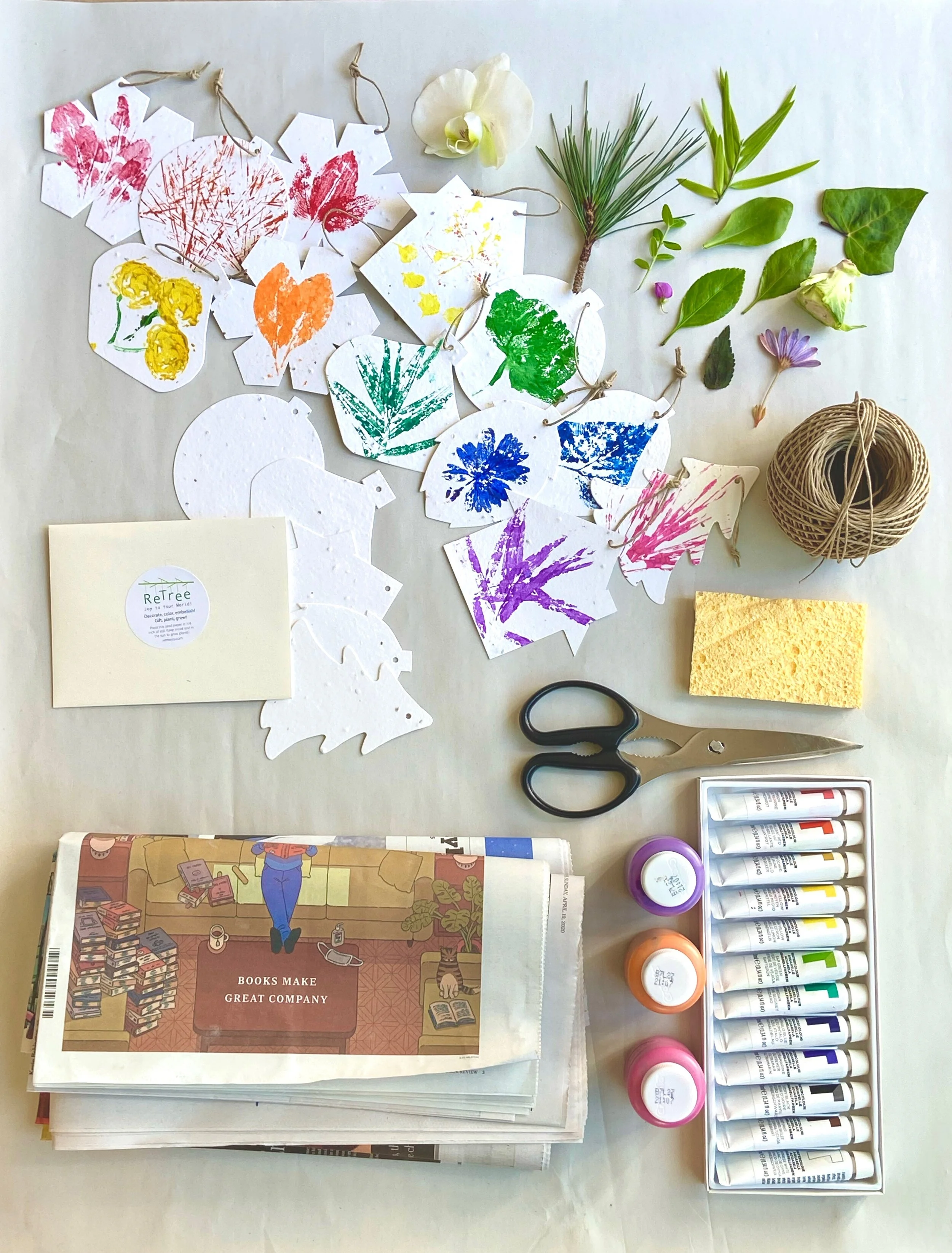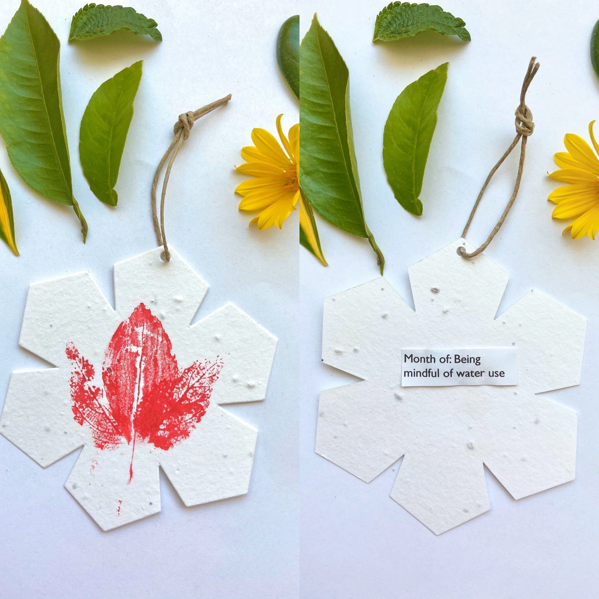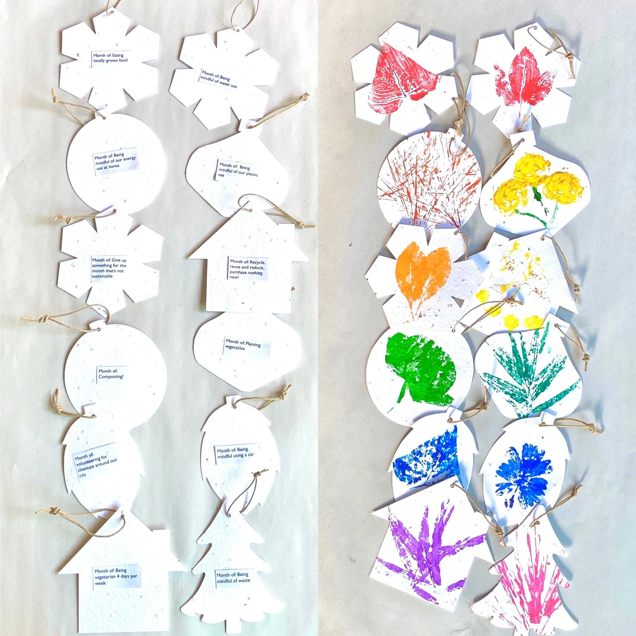 We wanted to celebrate Earth Day and these commitments too! So we created nature prints on our plantable ornaments to remember each one by!